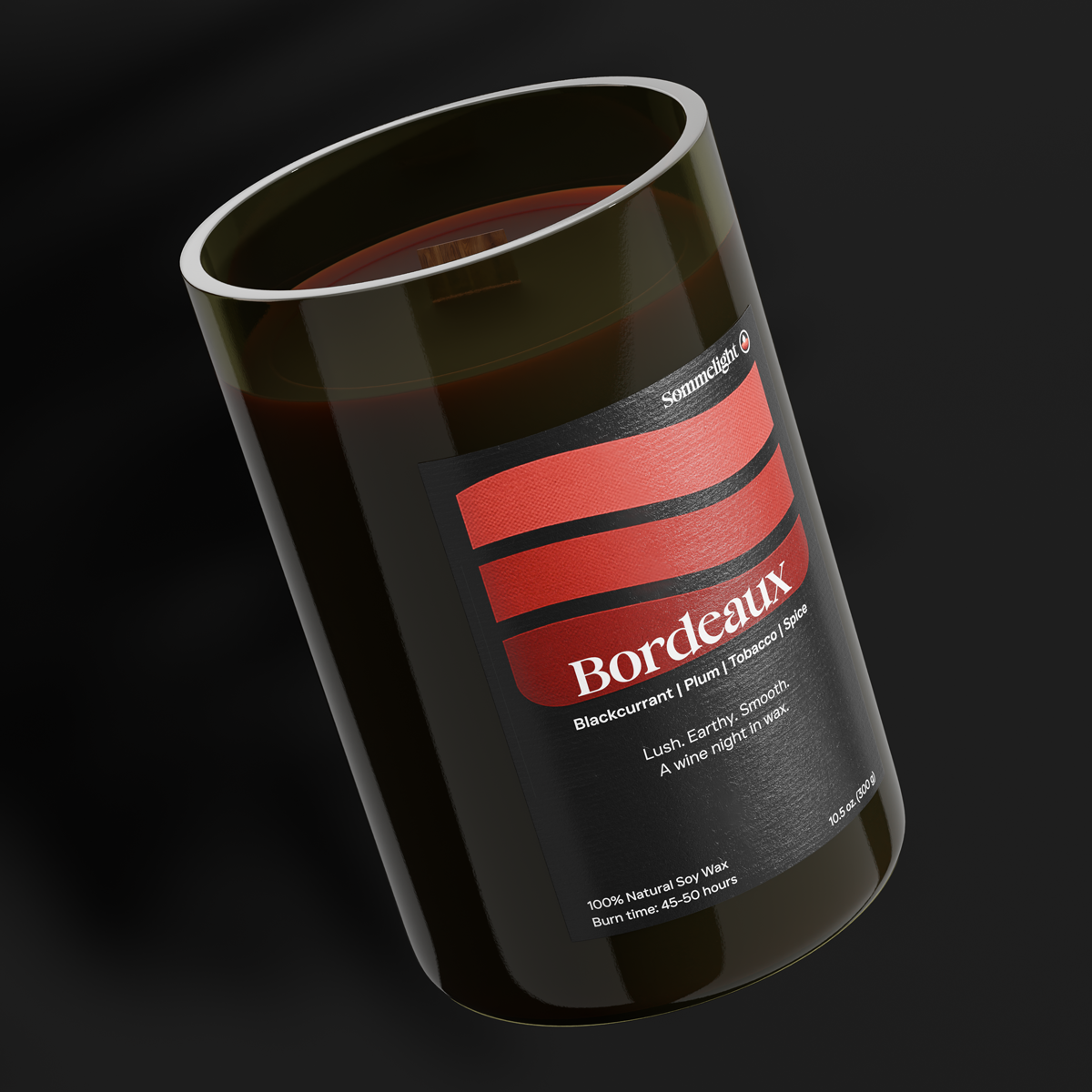 Each vessel begins as a reclaimed Bordeaux wine bottle, carefully cut, polished, and transformed into a premium upcycled glass. We hand-pour every candle using 100% natural soy wax, finishing it with a wooden wick that provides a gentle crackling glow — perfect for slow evenings and sensory rituals.